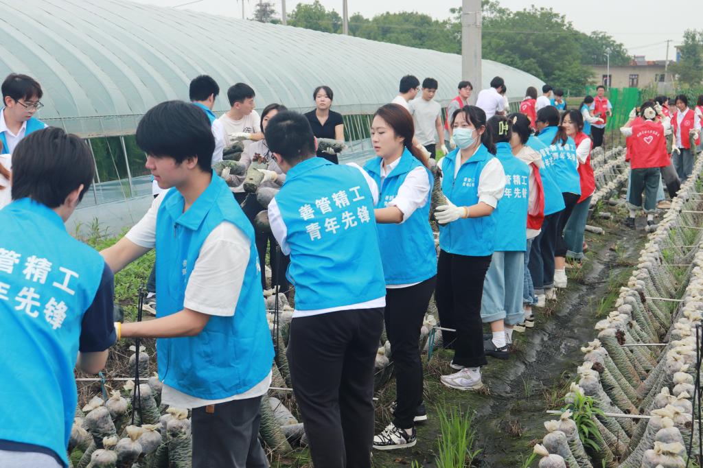 在劳动教育环节,黄宁辉向同学们系统讲解了特色农业的发展模式。分析木耳规模化种植和菜园等项目的运营机制,帮助同学们了解到特色产业对农村经济发展的带动作用。随后,师生党员深入生产基地,与当地村民共同走进田野,进行菌棒搬运、蔬菜采摘等农事劳作,在田间地头中知农情、解农忧,进行了一次生动的劳动教育实践党课。同时,学院与兴圩村共建“社会实践基地”和“劳动教育基地”,期待校地合作在实践育人中取得实质性进展。