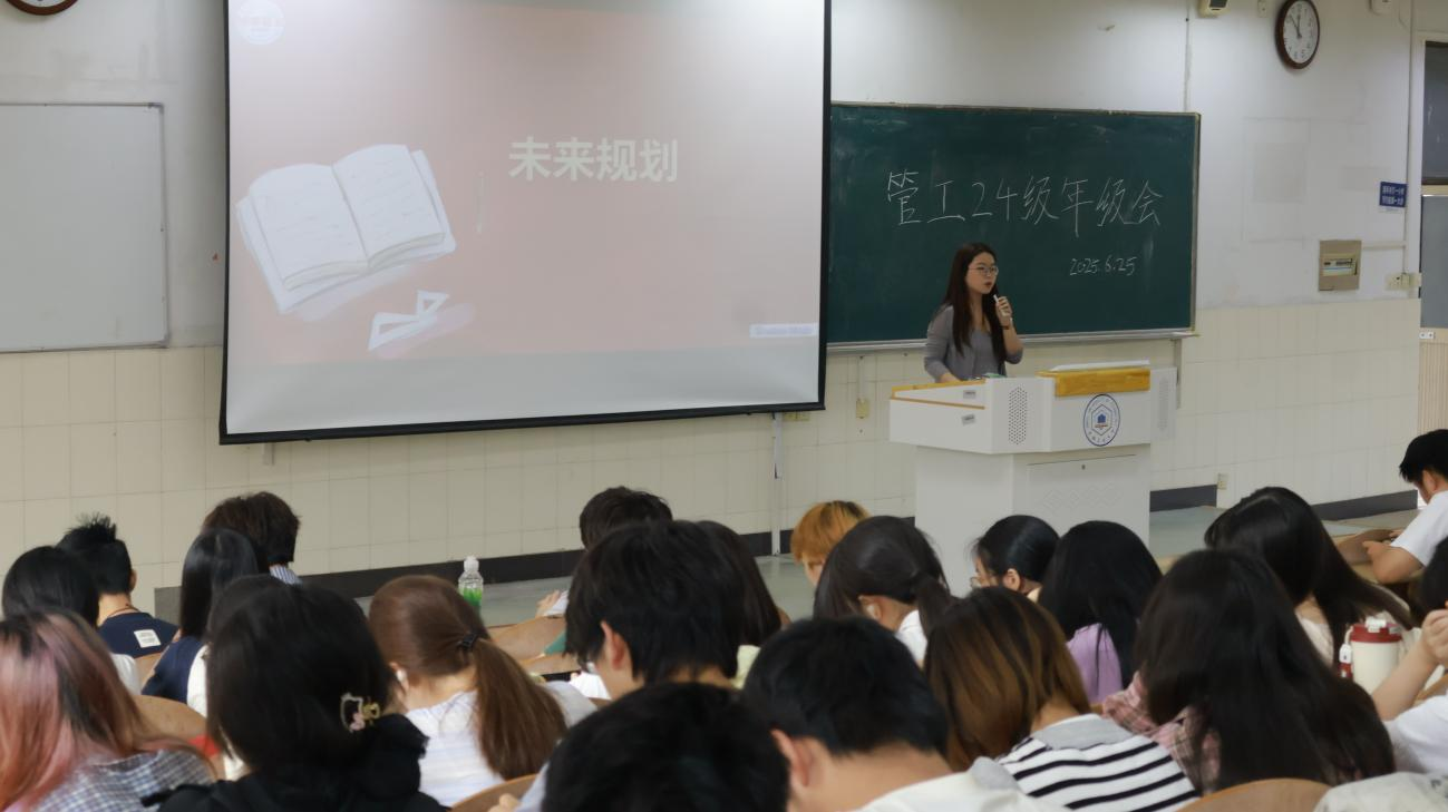 在阶教101召开“筑牢安全防线,严守诚信考纪”2024级期末年级会。李军慧与孙如梦围绕诚信考试、安全事项、新学期规划等内容,为全体学生上好学期“最后一课”。