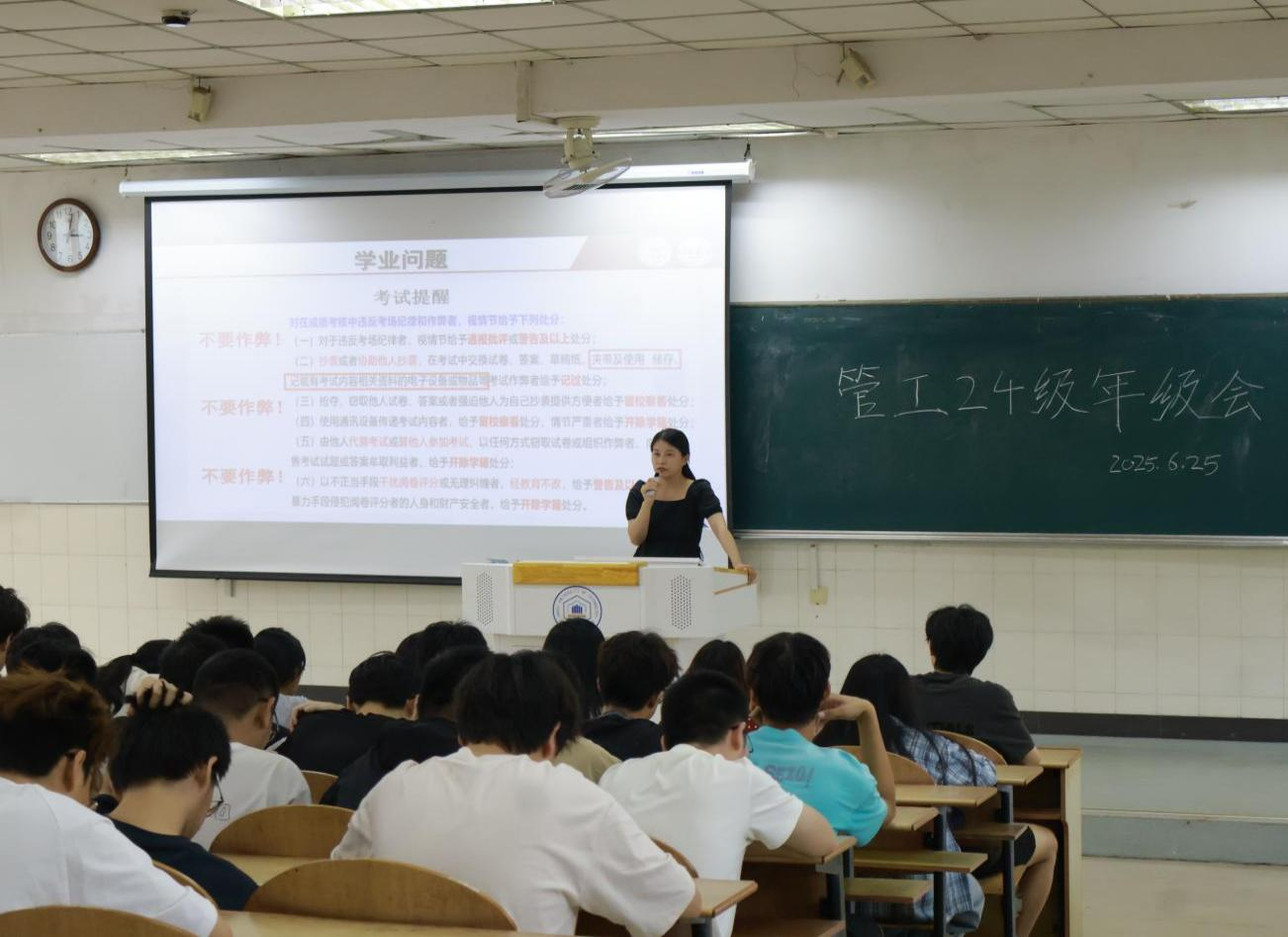 本次年级会既是一次严肃的考风考纪教育会,也是一场生动的暑期安全指导会。相信2024级全体学生定能将老师的教导内化于心、外化于行,在考场上交出诚信答卷,在假期里筑牢安全防线。