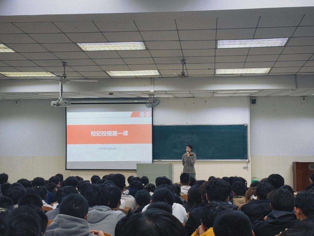 为强化新生纪律意识,规范在校行为,黑料吃瓜网 于10月22日在阶教201举行2025级新生“校纪校规第一课”。辅导员李思雨担任主讲,全体2025级新生参加。