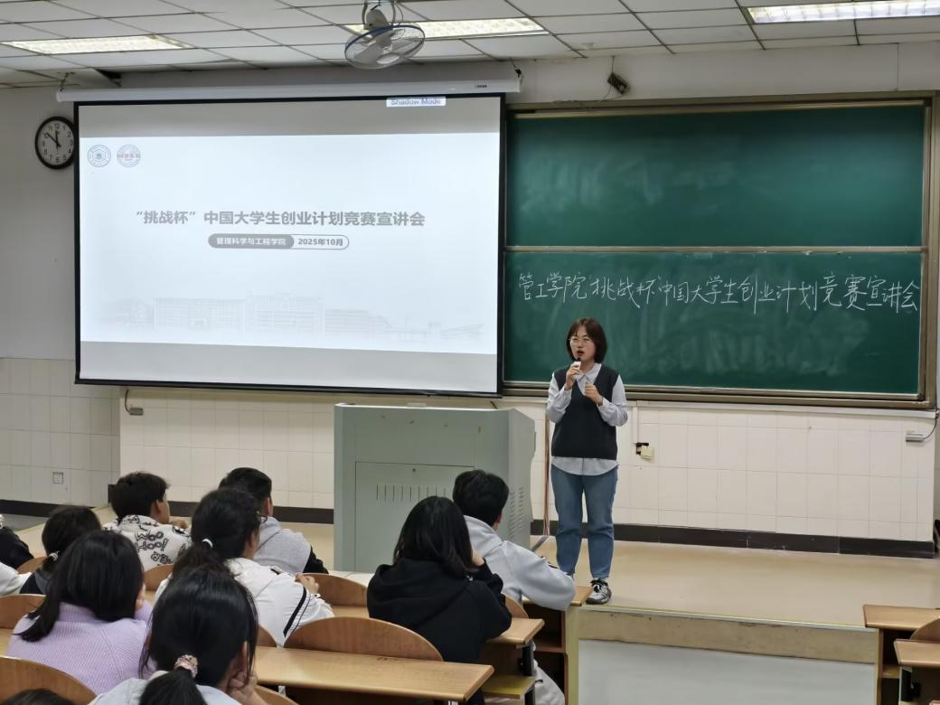 宣讲会上,赵玉婷结合“挑战杯”全国大学生课外学术科技作品竞赛指导经验,从大赛规则介绍与评分规则解读、各赛道选题分析等方面,系统为同学们进行了讲解。她指出,“挑战杯”不仅是一场知识竞技,更是团队协作与创新思维的实战平台,鼓励同学们积极组建团队、勇于尝试探索。会上,同时展示了学院部分优秀创业计划作品,以实际案例解析的形式帮助同学们更好地理解高质量创业计划的核心要素与规划路径。