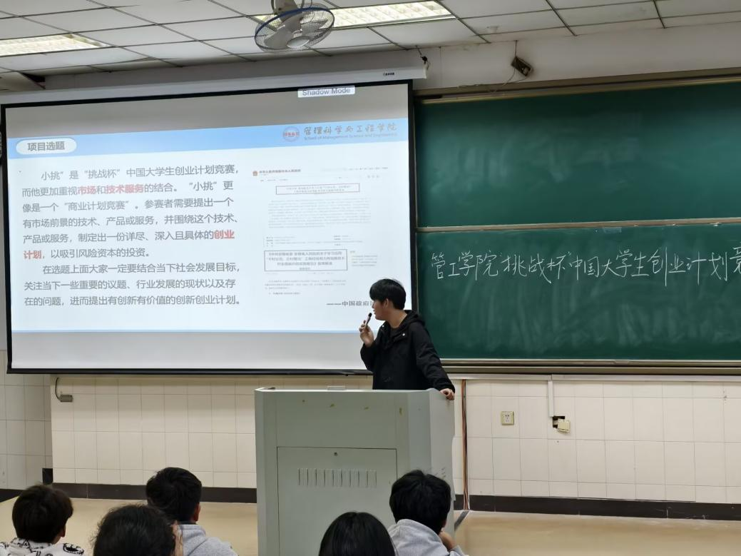于阶教202举办第十二届“挑战杯”中国大学生创业计划竞赛宣讲会。院团委书记赵玉婷、第十一届金奖获奖团队代表马黎明主讲,各年级学生代表200余人参加。