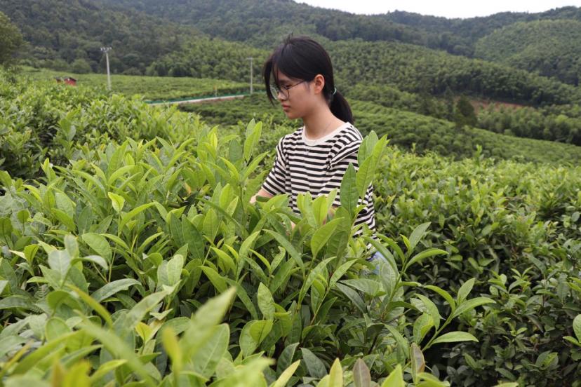 图为实践队员在茶园中尝试采摘茶叶,这便是鹿狮村村民致富的方法之一——茶叶发包。中国青年网通讯员 汤一鸣 摄