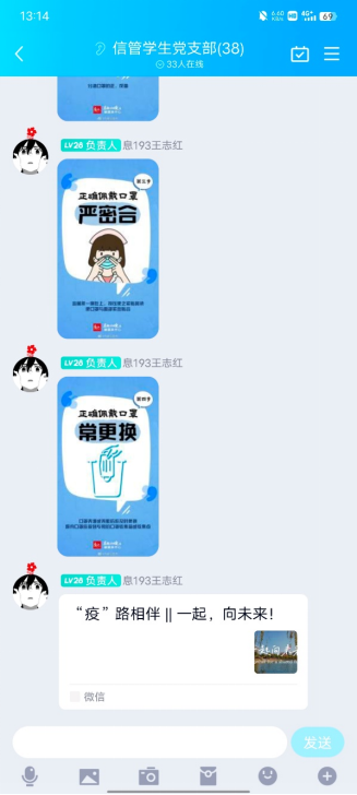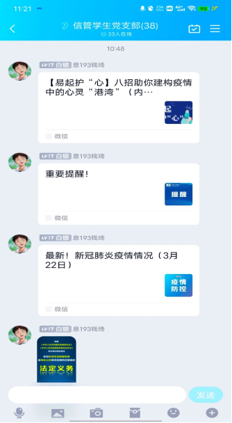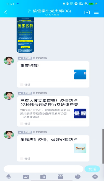 由于疫情特殊时刻,校园进行封闭管理且要求减少聚集,支部线下会议不能正常召开。支部书记刘瑜联合支部其他负责人钱琦、王志红等成员临时组建支部疫情防控宣传小组,在党支部的群里面向各位党员开展相关系列思想宣传工作。