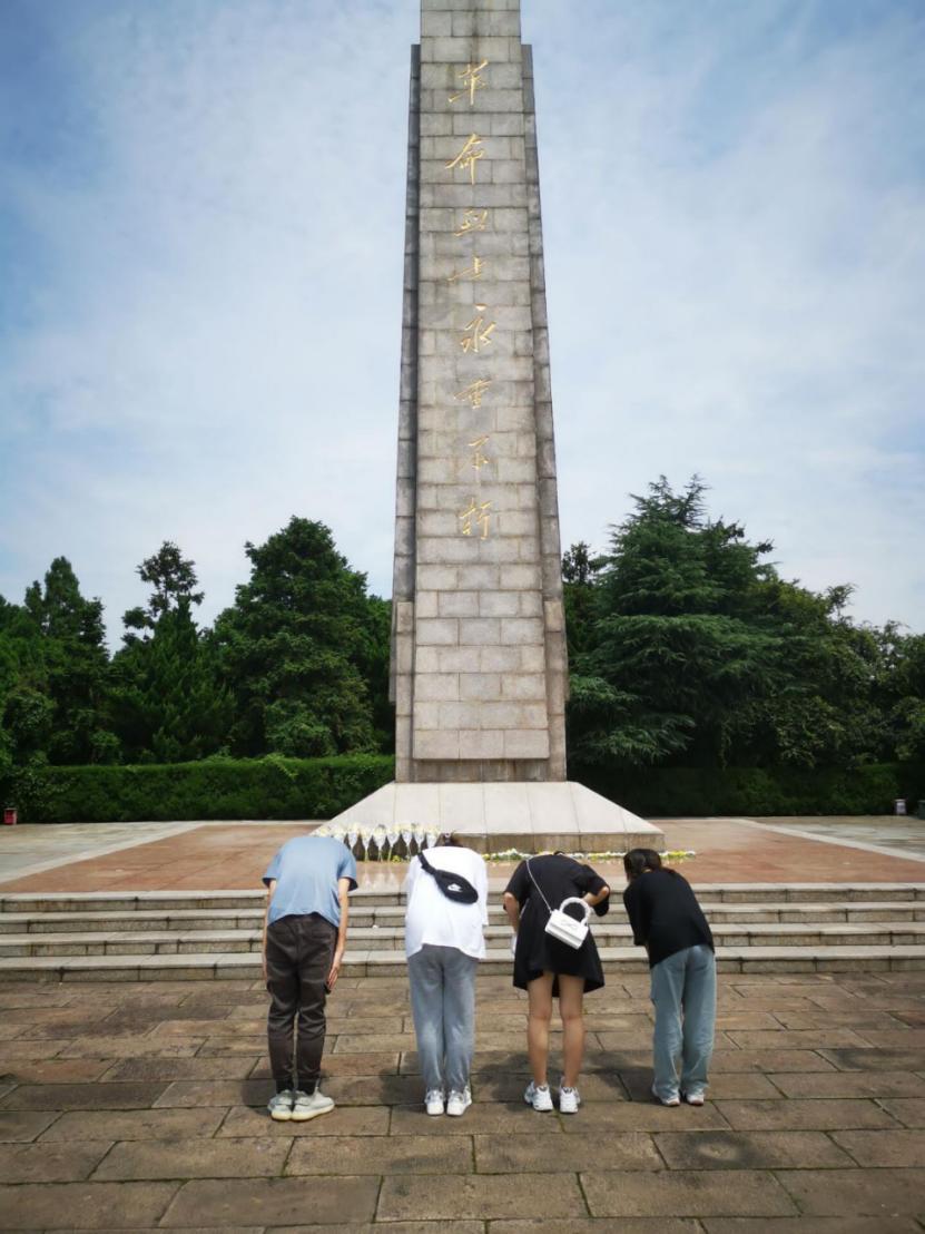 一抹抹金黄映在革命烈士纪念碑前,一道道人影也在碑前汇聚成线。实践队员们在纪念碑前鞠躬祭奠,深情凝视良久,以集体默哀一分钟的方式,表达对革命先烈的告慰与敬仰。而那一束束菊花,也正是实践团队为革命烈士献上的敬意。他们神情严肃,体态端庄,缅怀的同时更加告诫自己不忘初心、牢记使命,向社会向时代表以浓烈的责任感和使命感。