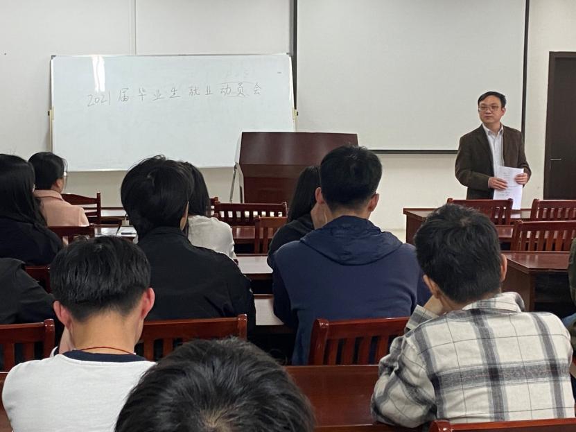 在汇文楼A308召开2021届毕业生就业推进会。院党委副书记王功成到会讲话,毕业班辅导员万媛媛、2021届部分未就业学生参加了本次会议。