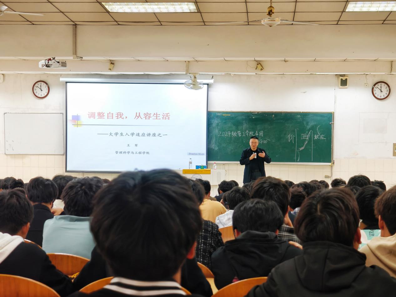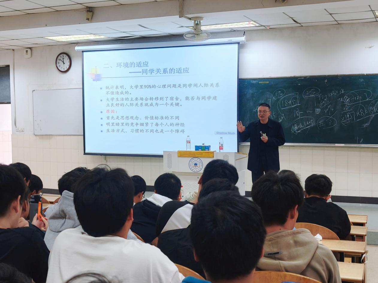 于阶教101开展《调整自我,从容生活》大学生入学适应心理健康讲座,本次讲座由学院党委书记王军教授主讲,2024级全体新生参与。