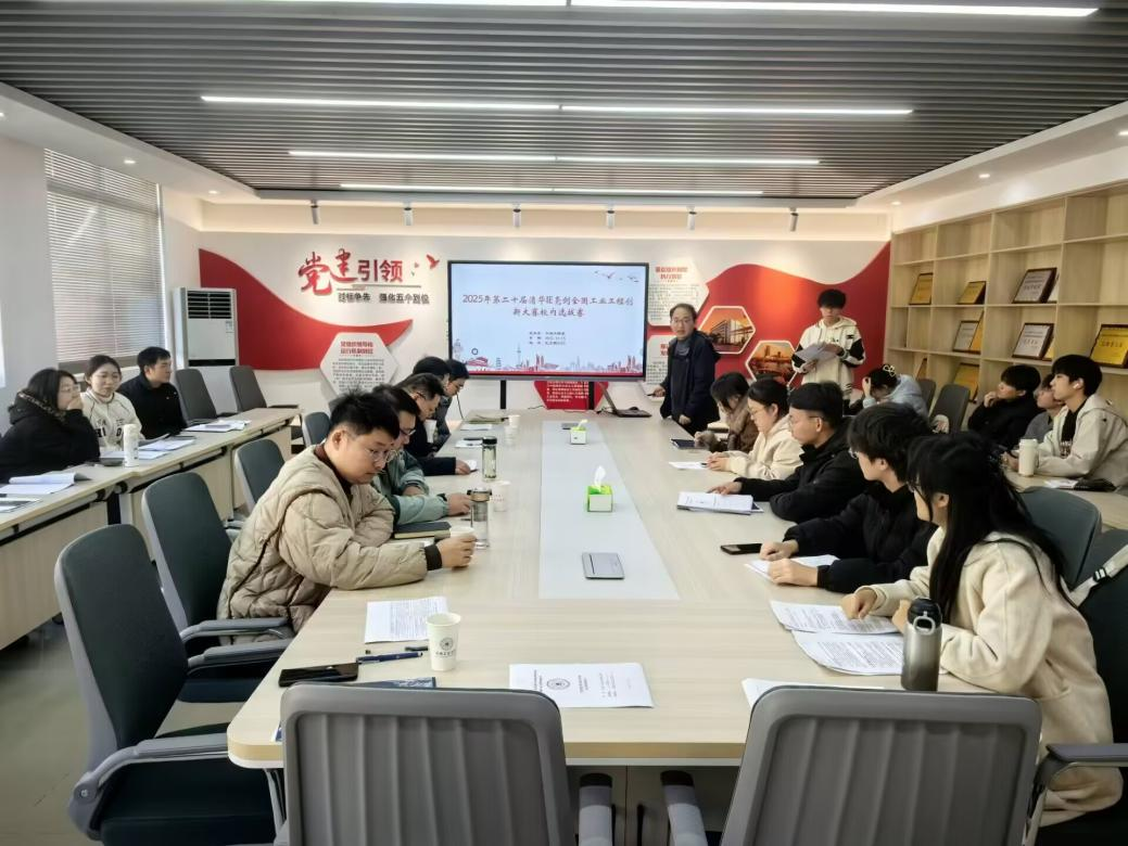 在汇文楼A302举办第二十届清华IE亮剑全国工业工程创新大赛校内选拔赛,学院教学副院长张洪亮、工业工程系主任刘舰、工业工程系教师代表评委,本科生组及研究生组共11支队伍参加比赛。