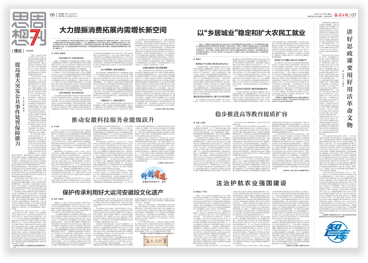 近日,学院运筹优化与智能决策科研创新团队在《安徽日报》2025年12月30日第6版,以“提高重大突发公共事件处置保障能力”为题,发表理论阐释文章。该文章围绕健全国家应急管理体系、强化处置保障能力这一重大选题,进行深入系统阐述,并提出了具有前瞻性、针对性的对策建议。