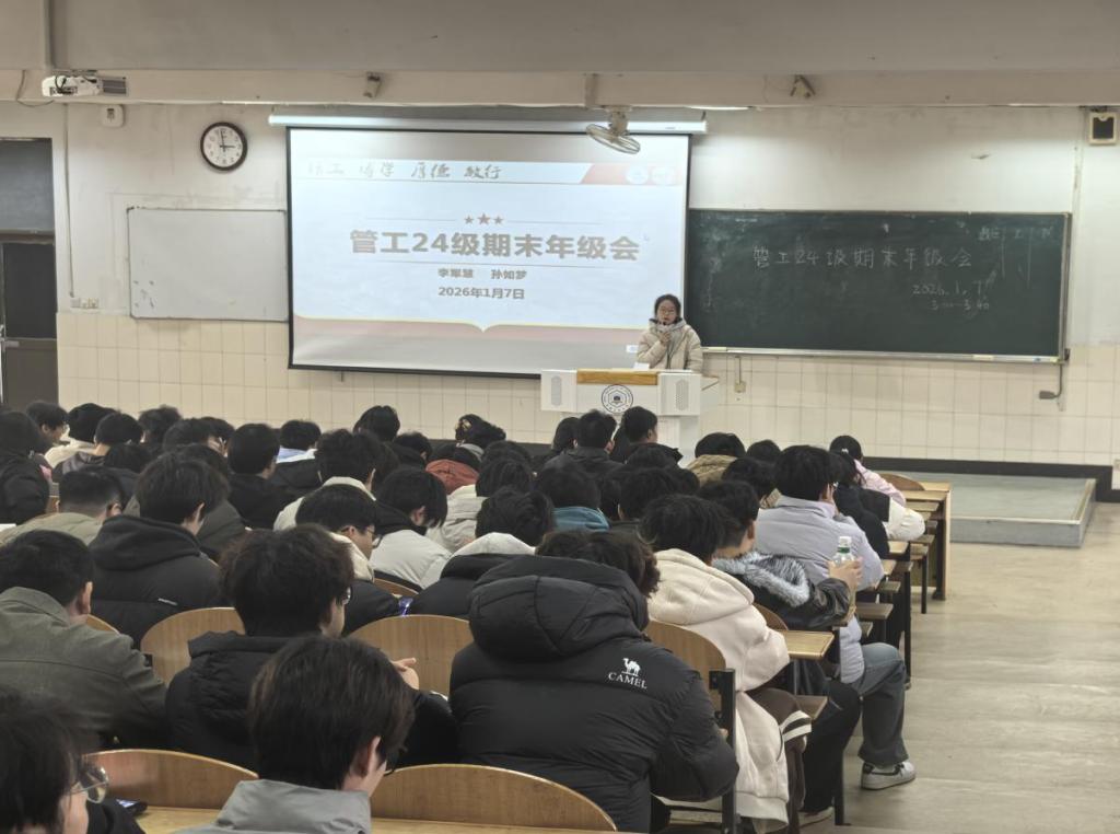 在阶教101召开2024级“明纪守规安全笃行”期末年级会,会议由2024级辅导员李军慧、孙如梦主持,2024级全体学生参加。