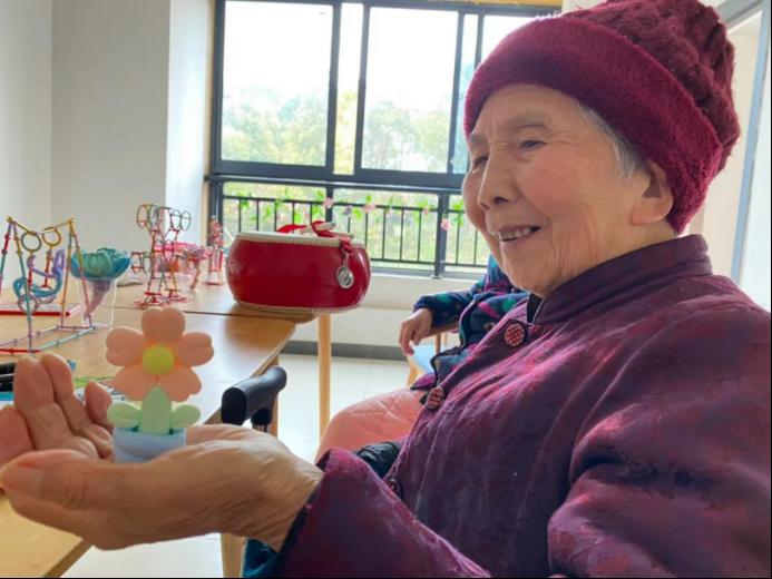 图为敬老院老人向实践队员展示自己的手工作品。通讯员 程莉娜 摄