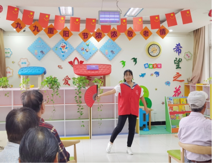 文艺表演。为庆祝重阳节,志愿者们精心为老人们准备了文艺表演活动。头戴红帽、身穿红马甲的11名志愿者们在社区负责人的带领下到达了活动现场,并开始了文艺表演。在歌曲表演《谢谢你》声中,活动拉开了序幕,志愿者们表演了展现大学生们青春活动的歌曲演唱《爱》,老年朋友们喜爱的扇子舞,歌曲合唱《童年》等节目,深受老人们的喜爱。在欢歌笑语中,志愿者们与老人们欢聚一堂,其乐融融。