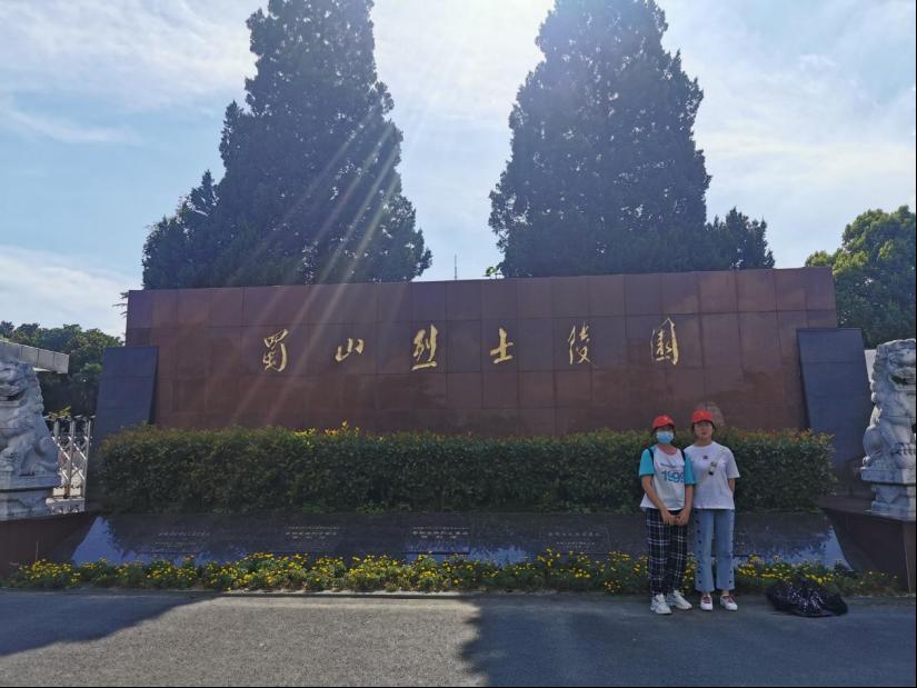 实践当日碧空万里,经过一个多小时的公交路程,实践队员们到达了蜀山烈士陵园,进入陵园后拾级而上。实践队员们先是来到了悼念广场,在广场西侧中央矗立着烈士纪念碑,碑上铸有邓小平题词的“江淮英烈永垂不朽”。纪念碑前时常放着游客们的鲜花,不时有人在碑前默哀。