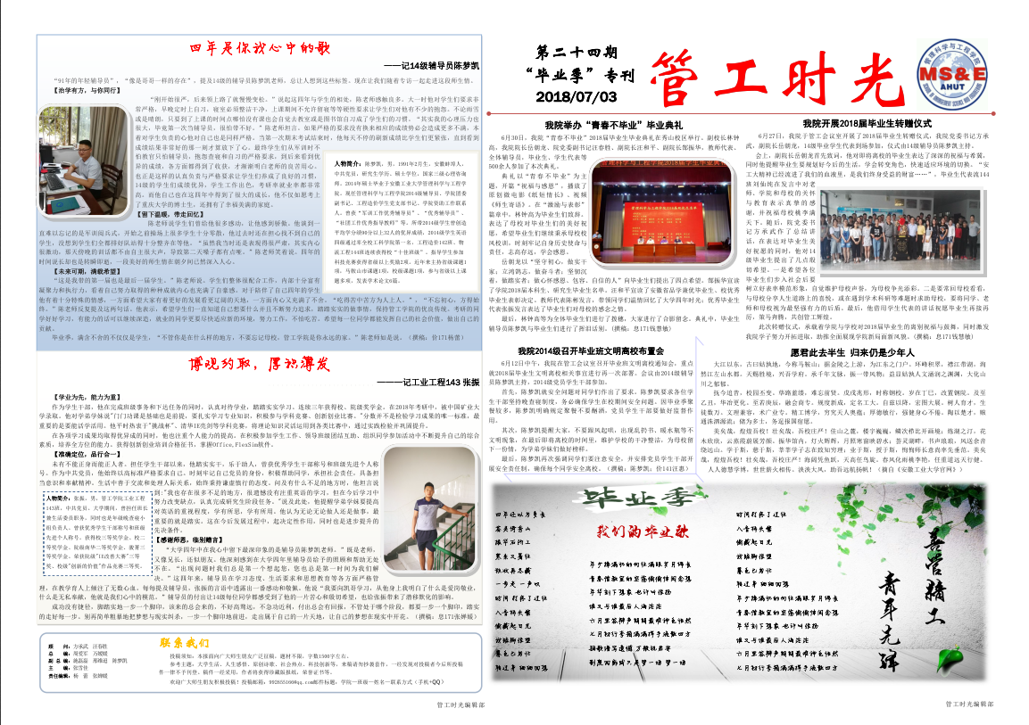 管工时光为黑料吃瓜网 院报宣传平台,负责学院传统媒体报纸的编辑、策划与排版,与月刊、半月刊的形式对黑料吃瓜网 近期重大活动事件进行综合报道,同时根据国家实事推出专刊。特设诗话管工环节,鼓励学生原创诗歌投稿,激发学生创作热情。以下为管工时光第二十四期第一、二版: